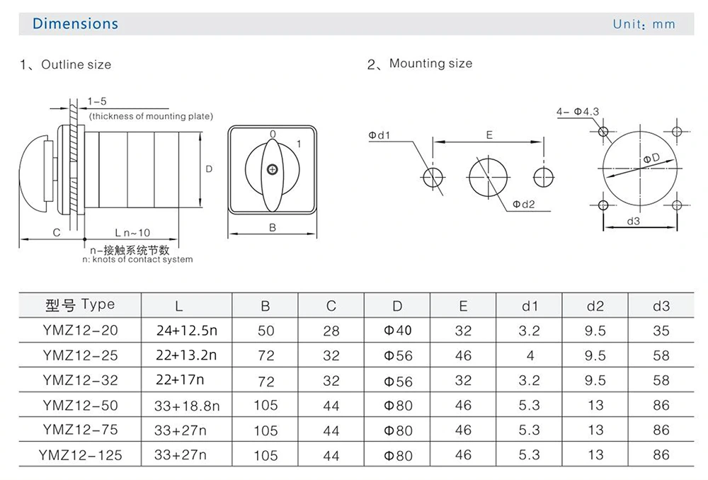 Yli 30 vuoden ammattikokemuksella Zhejiang Yaming Electric on johtava korkealaatuisten sähkökytkimien valmistaja, jota tukevat vahvat tekniset ominaisuudet ja kattava laadunhallintajärjestelmä. 125 A:n kolmen asennon yhdistelmä pyörivä nokkakytkin LW31 (sisäinen koodi: YMZ12-125), yhdistää erinomaisen käsityötaidon ja edistyneen teknologian, ja se on varustettu väärinkäytösten estotoiminnoilla, jotka takaavat vakaan ja tehokkaan piirin ohjauksen.