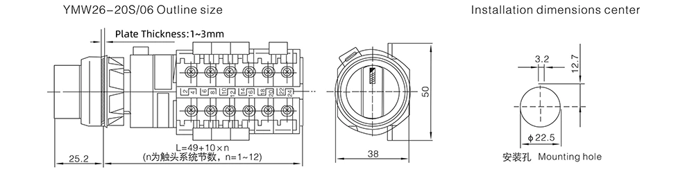 - Ylivoimainen rakennesuunnittelu: Siinä on virtaviivainen rakenne, jossa on 22 mm:n asennusreikä, joka on kompakti ja ei vie liikaa laitteistotilaa, mikä mahdollistaa joustavan asennuksen erilaisiin paneeliasetteluihin.