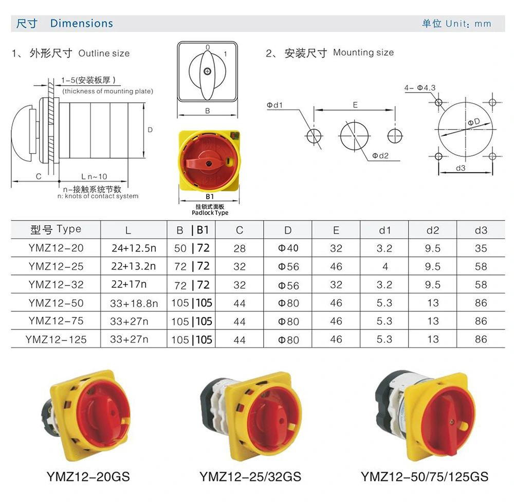 Tämä 50 A riippulukko OFF-ON kaksiasentoinen yhdistelmä pyörivä nokkakytkin (sisäinen malli: YMZ12-50GS) on suunniteltu 50 Hz AC sähköjärjestelmille, joiden nimellisjännite on jopa 690 V AC ja 240 V DC ja nimellisvirta 50 A.