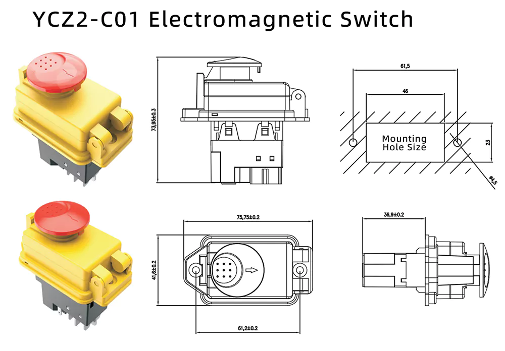Teollisuuden ohjausympäristöihin suunniteltu 8A:n pieni hätäpysäytyskannen painopainike sähkömagneettinen kytkin (malli: YCZ2-C01) on varustettu integroidulla sähkökatkossuojalla ja alijännitesuojalla, joka estää tehokkaasti odottamattomia laitevaurioita.